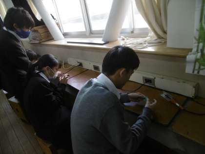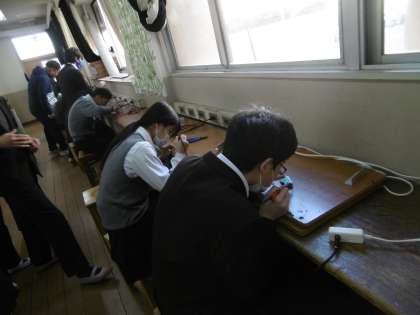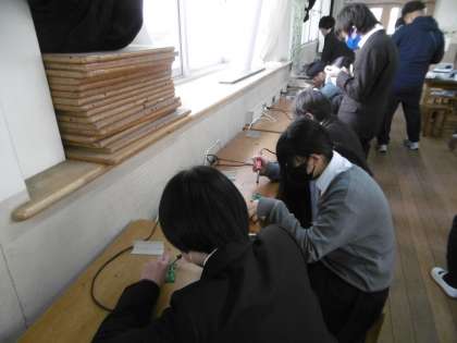 手回し発電付きラジオのはんだ付けを行っていました。安全確認を全員で行ったあとの実習の様子です。「先生っ、はんだ付けって楽しいな〜。」の生徒の発言が印象的でした。