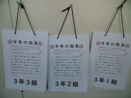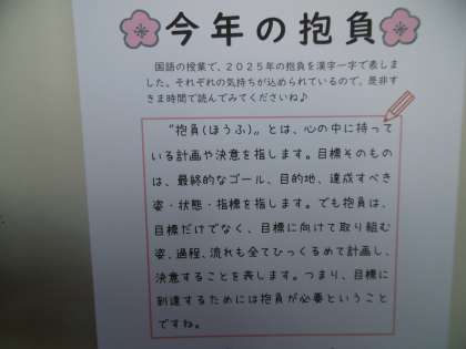 自分の抱負を漢字一字で表し、その意味を書くという授業を行いました。2階廊下に掲示されています。お子様の心のこもった作品を来校の際に、是非ご覧ください。