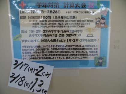 本校の数学科教員が企画した「学年対抗 計算大会」の3年生の期日が発表されました。2組は2月17日(月)、1組と3組は2月18日(火)です。45期生の健闘を祈ります。