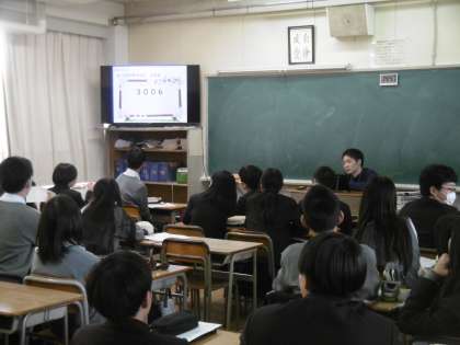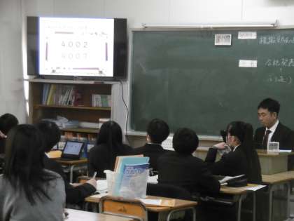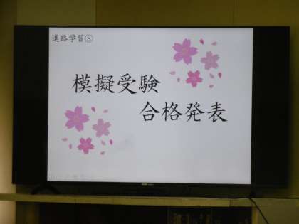 今日は2月10日(月)に受けた実力テストを来年受ける高校入試とみなして模擬受験を行った結果の「合格発表」の日でした。実力テストの目標点ごとに9つの架空の高校を作り、生徒が自分で高校を選ぶ(=目標点を決める)というシステムになっていました。各教室の大型テレビに映し出された合格番号(=目標点に達した生徒の受験番号)を見て、歓声が廊下まで聞こえていました。来年迎える自分の進路決定に向けて、とても有効な取り組み(学習)でした。次回の進路学習では、3年生で必ず各家庭から提出してただく「進路希望調査」について学習します。写真は2年1組、2年2組の合格発表の様子です。