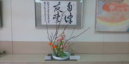地域の方が定期的に活けてくださっているお話です。校訓の「自律・友愛」とともに職員玄関を素敵な空間にしています。地域の方が時には朝早く来校され、お花の手入れをしてくださっています。たくさんの教職員や生徒がこのお花を見て、元気になっています。