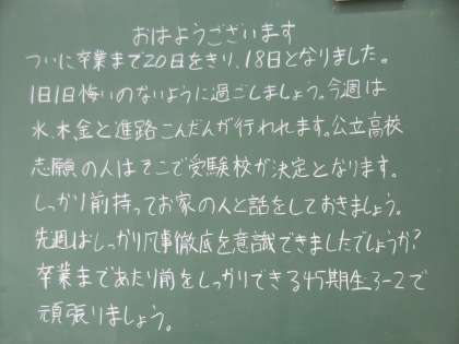 写真は3年2組の教室に書かれていた今朝のメッセージです。担任の先生は、毎朝生徒へのメッセージを1年間一日も欠かさず続けました。