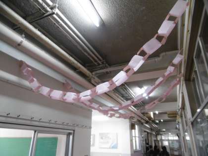 来週の2月26日(水)に行われるピンクシャツデー(いじめをなくす取り組み)の取り組みに賛同してくれる人は、自分の名前とメッセージを廊下に用意されているピンク色の画用紙に書いて掲示しています。たくさんの人の賛同があって、3本になりました。