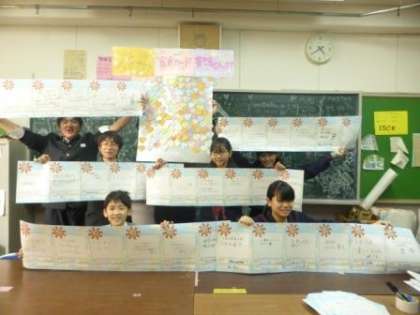 2007年の2月14日にその当時の生徒会長の呼びかけで生徒会から全校生徒に提案をして発足しました。結成記念日にあわせて,「いじめノックアウト行動宣言」のシートを,一階の壁いっぱいに貼ろうと生徒会役員とボランティアさんで準備しています。