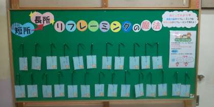 本校の養護教諭が作製している保健室前廊下の掲示物。今回は「リフレーミングについて」でした。リフレーミングとは、ものの見方の枠(フレーム)をかえて、短所を長所にチクチクことばをふわふわことばにかえることです。例えば、水が入っているコップを「もう半分しか残っていない」と考えのではなく、「まだ半分も残っている」と考えると随分、気持ちも前向きに楽になるというものです。