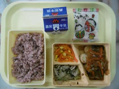 今日のメニューは、赤飯、豆腐ハンバーグ野菜あんかけ、豚肉と青菜の炒め物、にんじんのレモンしょうゆ和え、ひなあられ、牛乳です。