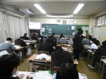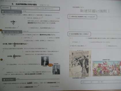 授業のめあては「自由民権運動が広まっていった背景とその後の様子が分かる」でした。今日もとても丁寧に、分かりやすく作られた授業用プリントが大活躍でした。社会科を得意とする生徒(ミニティーチャー)がそのプリントを使って、クラスメイトに教えている場面を見ることができました。