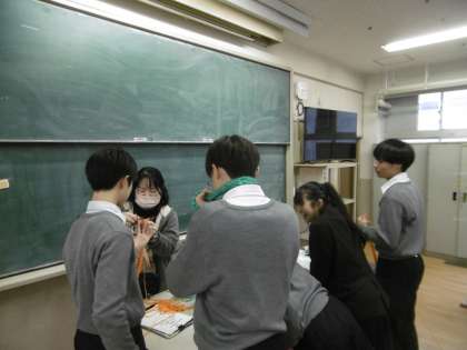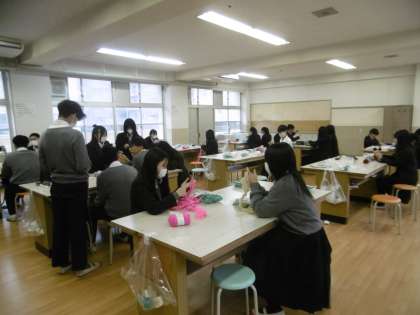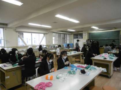 学習教材は「指編みマフラー」でした。指を使って、毛糸のマフラーを編むという授業でした。とても意欲的に授業に参加をしている生徒の姿が印象的でした。授業はとても盛り上がっていました。