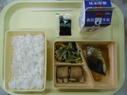 今日のメニューは、白ごはん、さわらのしょうがあん、鶏もも肉と厚揚げの簡単煮物、かつお和え、のりの佃煮、牛乳です。