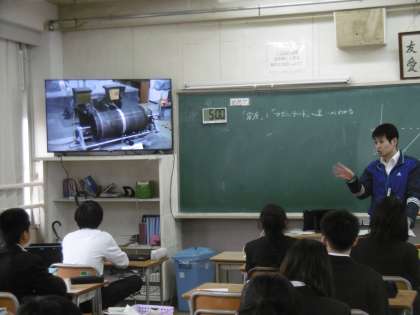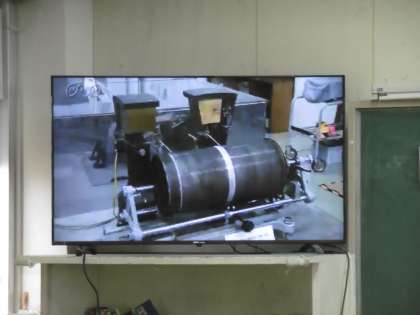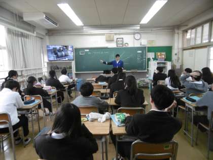「地震とマグニチュードの違いが分かる」が授業のめあてでした。大型テレビに映し出された映像を見ながら、授業の導入が行われていました。