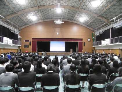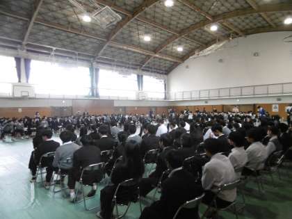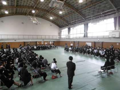後期生徒総会が今日の午後、体育館で行われました。後期生徒会や各生徒委員会(風紀・美化・体育・文化・図書・保健給食・学級・文化祭実行)から、後期の活動について報告が行われました。