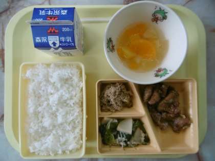 今日のニューは、白ごはん、鶏肉の唐揚げ、チンゲン菜とえのきの和え物、シーチキンのそぼろ煮、フルーツカクテル、牛乳です。