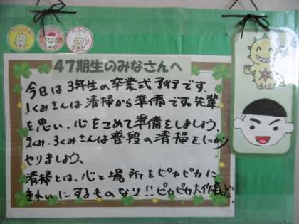 午後に行われる卒業式予行に向けて、メッセージが書かれていました。今日の卒業式予行の準備は、47期生が心を込めて行います。