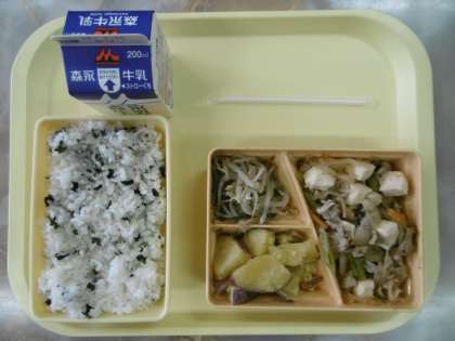今日のメニューは、わかめごはん、豆腐のチャンプル、さつまいもの煮物、もやし炒め、牛乳です。