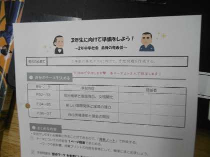 授業のめあては「3年生の単元テストに向けて、予想問題を作成する」でした。班の係分担は以下の通りです。