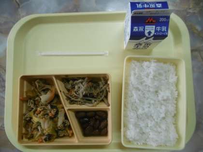 今日のメニューは、白ごはん、スタミナ炒め、ごぼうサラダ、金時豆の煮物、牛乳です。