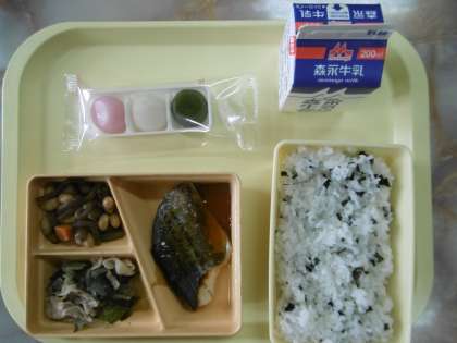 今日のメニューは、わかめごはん、さわらのしょうがあん、豚肉と青菜の炒め物、五目豆、花見団子、牛乳です。
