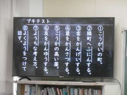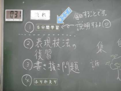 漢字テストが行われていました。授業の流れもきちんと示され、生徒は今、授業のどの位置にいるかや、今何をやるべきかを理解して授業を受けていました。