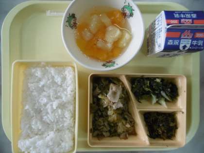 今日のメニューは、白ごはん、回鍋肉、ごま和え、佃煮ふりかけ、フルーツミックス、牛乳です。