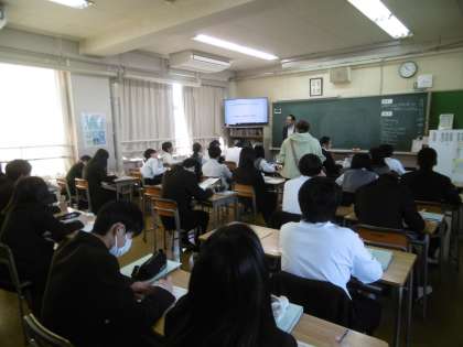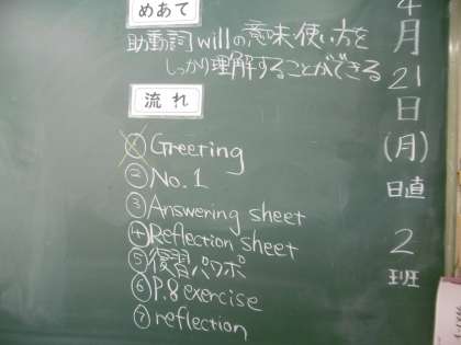 授業のめあては「助動詞willの意味、使い方をしっかり理解することができる」でした。授業の流れも英語で表されていました。通学カバンもきちんとロッカーに入れられており、当たり前の行動の継続に感心しました。