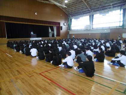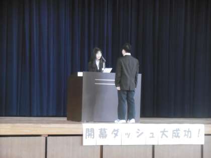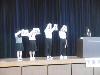8時30分の時間どおりに集会が始まりました。生徒会役員の進行は今日も完璧でした。校長からは「開幕ダッシュ大成功」と題して、とてもよかった4月のスタートについて全校生徒に労いの言葉をかけました。生徒会長からは、生徒委員会の認証状を代表生徒に渡しました。最後に生徒会から、先日の生徒研修会で話し合って決定したスローガン「TEAM320」の発表がありました。