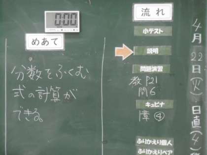 授業のめあては「文字式の分数を含む式の計算ができる」でした。今日も授業の流れがきちんと黒板に示されていました。