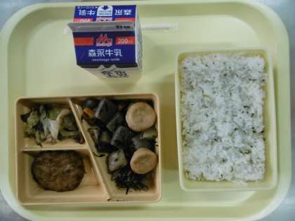 今日のメニューは、菜めし、いそ煮、キャベツ入つくね揚げ、青菜の油炒め、牛乳です。