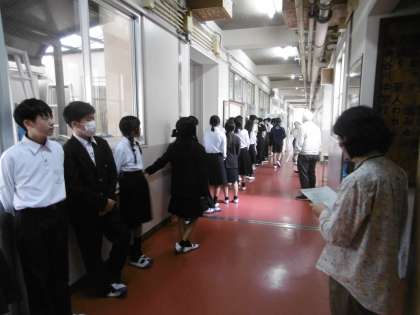 眼科検診、内科検診(3年生)に続き、本日、全学年で耳鼻科検診がありました。写真は静かに自分の順番を待つことができている1年生の様子です。