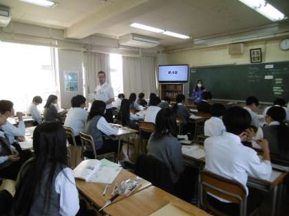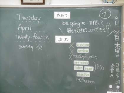 授業のめあては「be going to・・・を使って、疑問文を作ることができる」でした。授業の流れも英語で書かれていました。単語の発音練習では、大きな声を出すことができていました。