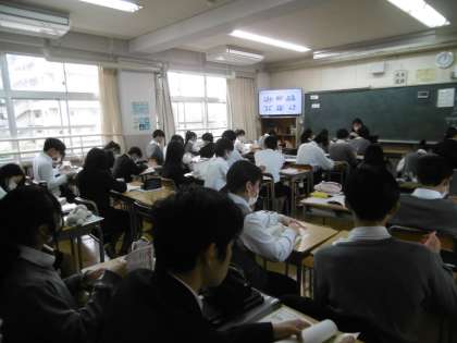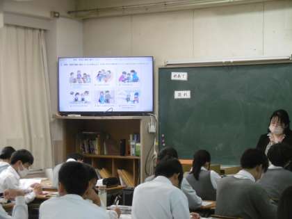 学習内容は「家族・家庭の機能(働き)とは?」でした。生徒は先生の話を静かに聞いていました。