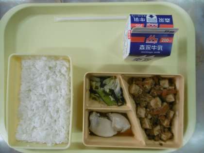 今日のメニューは、白ごはん、マーボードーフ、鶏肉の照り焼き、白菜のおかか、牛乳です。