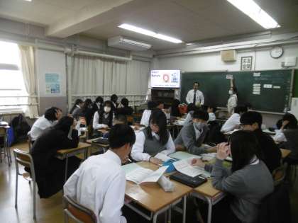 写真は班で発表するための準備の時間でした。生徒のワクワク感やドキドキ感が伝わってくる授業でした。
