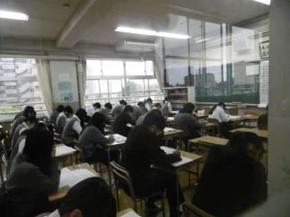 今年度も5回予定されている実力テストの第一回が行われています。進路指導委員会で話し合うための大切な資料にもなりますので、最後まで全力でテストを受けましょう。無解答をなくすことが、点数アップの近道です。写真は上から、3年1組、3年2組、3年3組です。第二回実力テストは、8月27日(水)です。