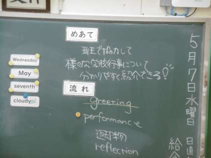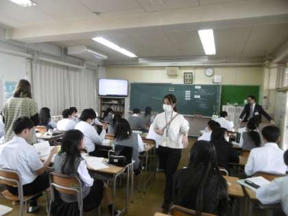 授業のめあては「班で協力して様々な学校行事について、分かりやすく紹介できる」でした。AET(英語実習助手)を含め、3名の英語科の教員で授業が楽しく進められていました。