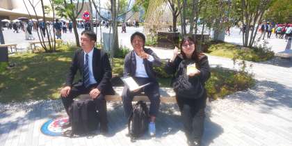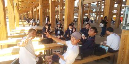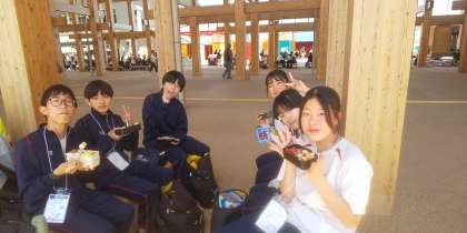 早速、昼食を食べている3年生と出会いました。作ってもらったお弁当をおいしそうに食べていました。先生方も仲良く、昼食です。