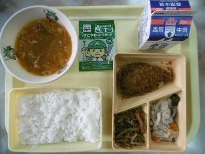 今日のメニューは、白ごはん、あじの磯辺フライ、こんにゃくのチャプチェ、きんぴらごぼう、ふりかけ、ピリ辛キムチスープ、牛乳です。