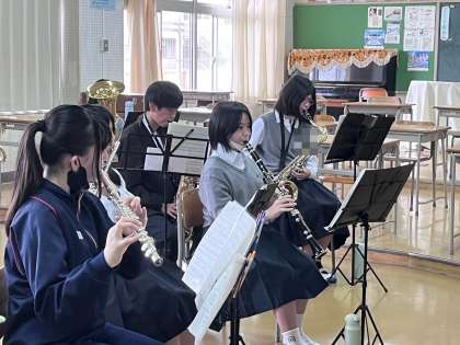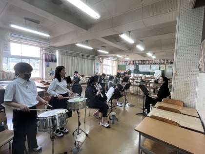 校内では、吹奏楽部が練習をがんばっていました。「がんばる時はいつも今」がよく似合っています。