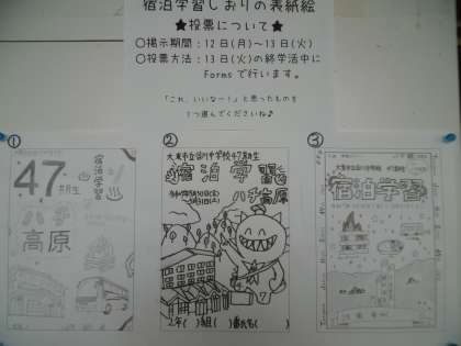 3名の生徒が宿泊学習のしおりの表紙絵を書いてくれました。明日の終学活時にみんなで投票します。