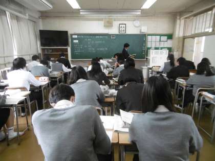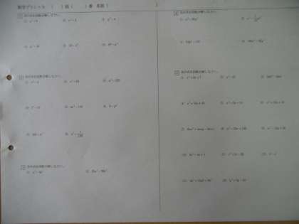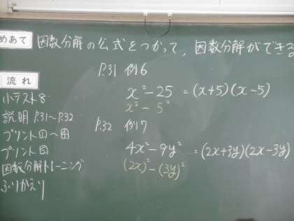 授業のめあては「因数分解の公式を使って、因数分解ができる」でした。全員が一生懸命に学習プリントを解いていました。みんなでがんばる、みんなががんばることがかっこいいです。さすが46期生です。