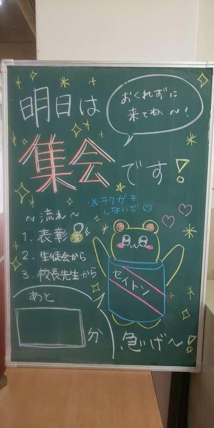 生徒会役員が素敵な黒板を作成してくれました。明日の全校集会の開始時間は8時30分。5分前には整列が完了しておきましょう。やればできる谷中生です。