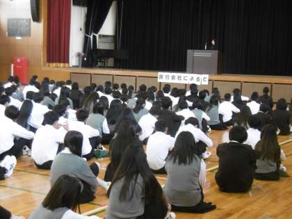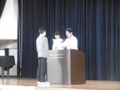 陸上部とバドミントン部の賞状伝達を行いました。校長からは「修学旅行や宿泊学習を成功させるための時間の使い方」を生徒に話しました。生徒会長からは先日の全校遠足で行った大阪・関西万博の感想が述べられていました。今日も320名の全校生徒がきちんと集合し、時間通りに全校集会が始まりました。