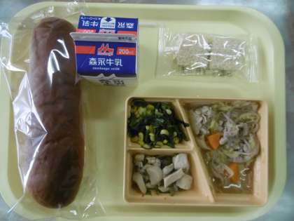 今日のメニューは、黒糖パン、八宝菜、おこげ、鶏のゆずこしょう炒め、ポパイコーンソテー、牛乳です。