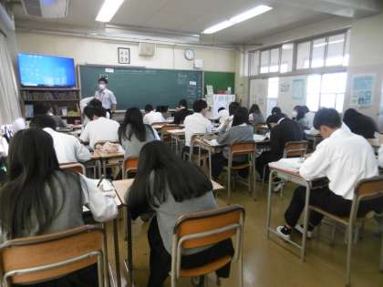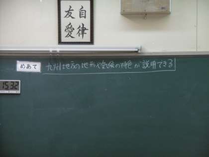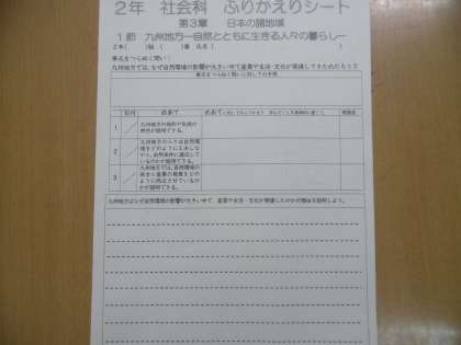 授業のめあては「九州地方の地形や気候の特色が説明できる」でした。振り返りシートもうまく活用しながら、授業がスムーズに進んでいました。