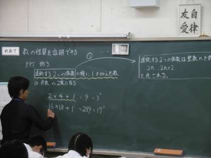 授業のめあては「数の性質を説明できる」でした。生徒は「連続する2つの偶数の積に1を加えた数は、奇数の2乗になる」という問題の解説を聞いていました。ちなみに、テストによく出題される問題は、