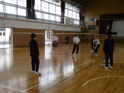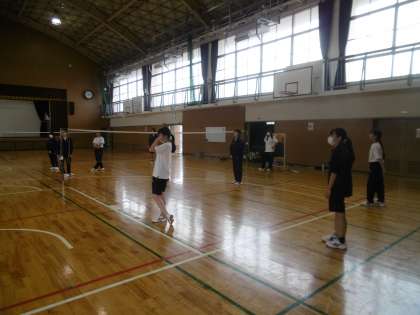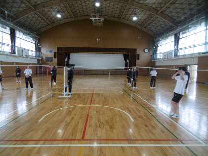 学習内容は「バレーボール」でした。今日は、バドミントン用のネットを使って、技術が身に付きやすいようして授業が行われていました。子どもたちは、今日も教科担当の先生の話を静かによく聞いていました。