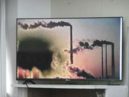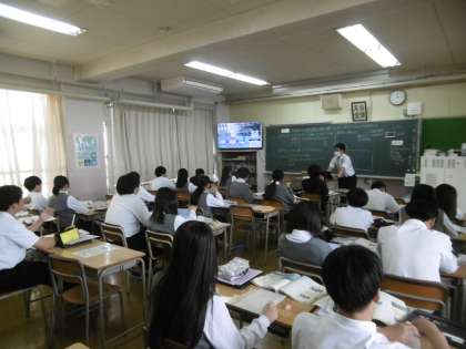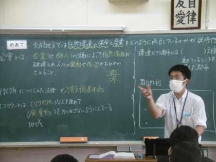 授業のめあては「九州地方では自然環境の保全と産業をどのように両立しているのかが説明できる」でした。大型テレビに今まで起こった公害についての写真が映し出されていました。
