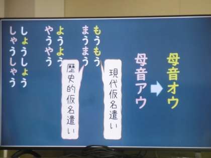 学習教材は「枕草子」、授業のめあては「仮名遣いを完璧にしよう」でした。生徒は歴史的仮名遣いが書かれたカードを班で話し合いながら、現代仮名遣いにしていました。