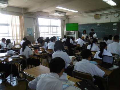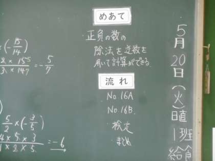 授業のめあては「正負の数の除法を逆数を用いて計算できる」でした。今日も48期生の先生の話を聞く態度は、抜群でした。
