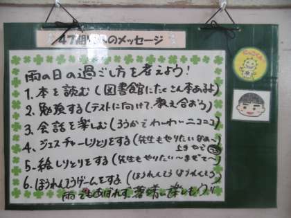 雨の日の過ごし方について、書かれていました。「本を読む、勉強する、会話を楽しむ、ジェスチャーしりとりをする、絵しりとりをする、ほうれんそうゲームをする」と書かれていました。是非、参考にしましょう。