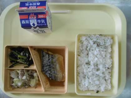 今日のメニューは、鯖のみそ煮、豚バラとキャベツの塩だれ炒め、小松菜のしらす和え、牛乳です。